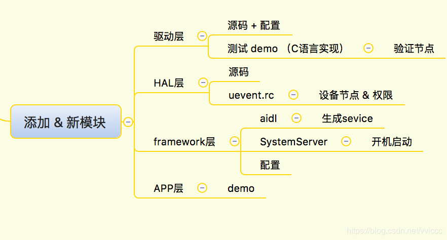 这里主要关注➕右下角部分 添加新模块即可。本章节详细解读了android新模块从驱动层、HAL层、framework层、APP层的流程。上面的图添加新模块部分可能会看不清,这里单独截取该部分,如下所示: